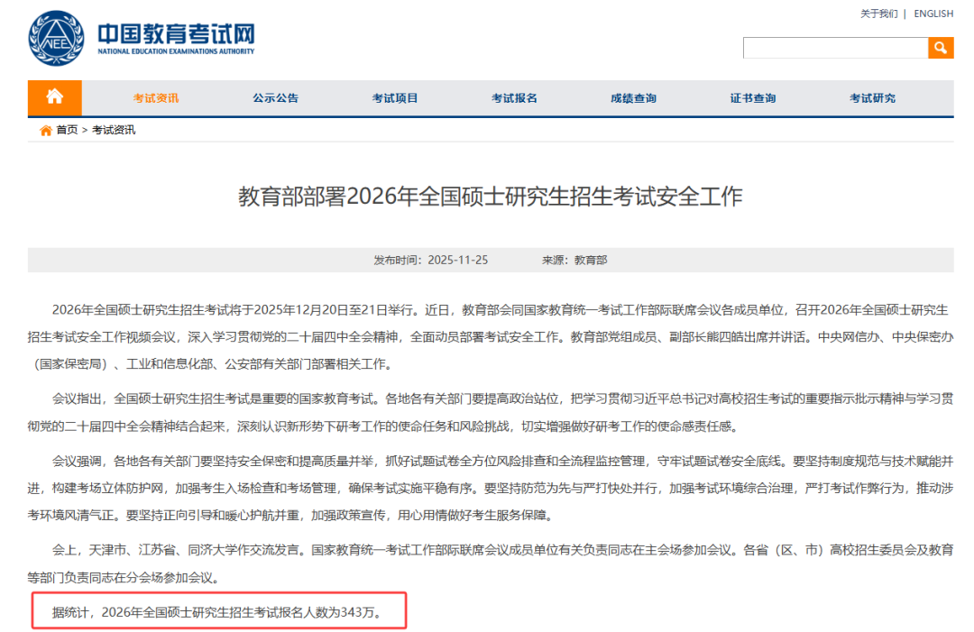 近日,教育部正式公布——2026年考研报名人数约343万人!对比去年直接再降45万!